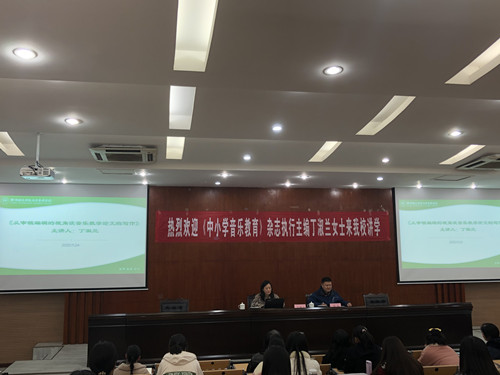 11月24日下午3:20,我系邀请中国音乐家协会会员、《中小学音乐教育》杂志执行主编、浙江省文联传媒中心编辑出版部主任,副主编丁淑兰女士来校作学术讲座。此次讲座主题为《从审稿编辑的视角谈音乐教学论文的写作》。讲座由闫兵副主任主持,徐州市音乐家协会李姗姗秘书长和部分会员,我系陈繁书记、儿童数字音乐中心负责人高志副教授和部分师生代表参加了活动。