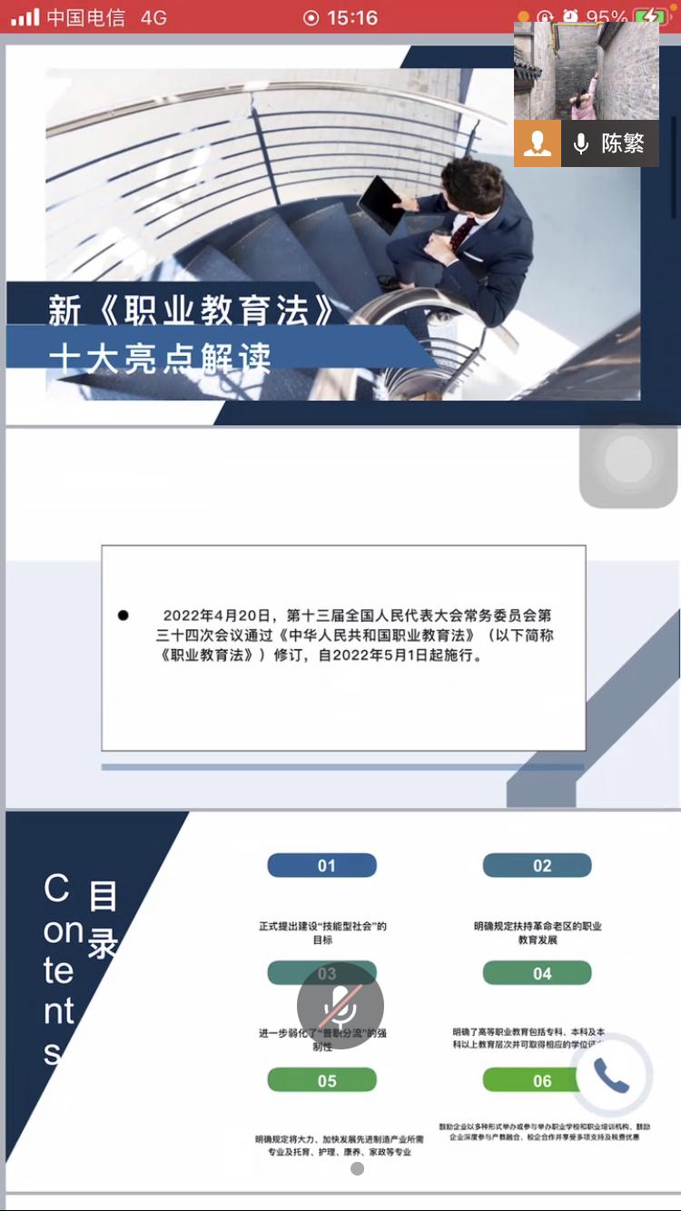 为深入贯彻落实全国职业教育大会精神,做好新《职业教育法》普法工作,全面准确解读新《职业教育法》,持续推进依法治教、依法办学,6月21日15:30,公司党总支开展二级理论中心组线上学习活动,活动由陈繁书记主持,党总支委员和三级党支部书记参与了此次学习。