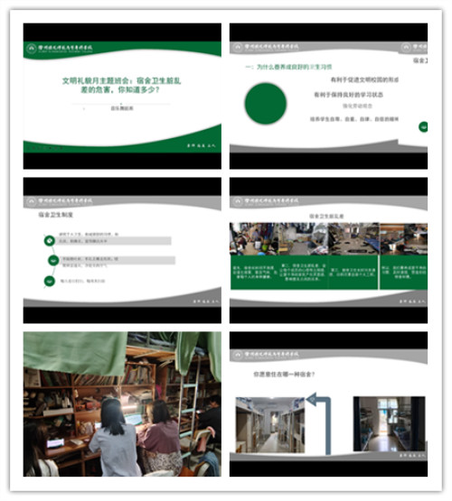 各班辅导员、班主任向同学们介绍了良好的宿舍环境对同学们身心健康发展的重要性。通过宿舍卫生情况的图片对比,引导同学们积极发言,表达自己的想法,探讨为什么养成良好的卫生习惯,如何保持干净整洁的宿舍环境等。