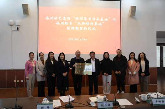 吴笛为公司“徐州琴书传承基地”授牌,韩坤与李雪梅代表双方签订“双师培训基地”协议。